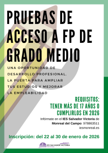 Desde el 22 al 30 de enero se pueden presentar las solicitudes para las Pruebas de Acceso a ciclos formativos de Formación Profesional y Enseñanzas Deportivas correspondientes al año 2026. De acuerdo con el artículo 4 de la Orden ECD/83/2017, de 25 de enero, podrán presentarse a las pruebas de acceso de grado medio quienes …